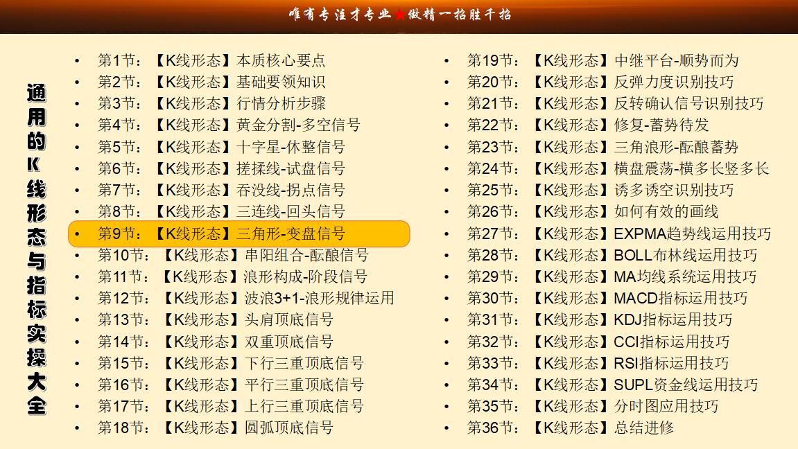 一张K线图包含了市场一切信息、也包括市场投资者的人性行为,K线形态图分析是最直观、最及时、最有效的一种方式,本系列通用K线形态课程是指(凡是有K线的市场都适用),从头到尾全是干货,不渗一点水份,能达到现学现用、立竿见影的效果。