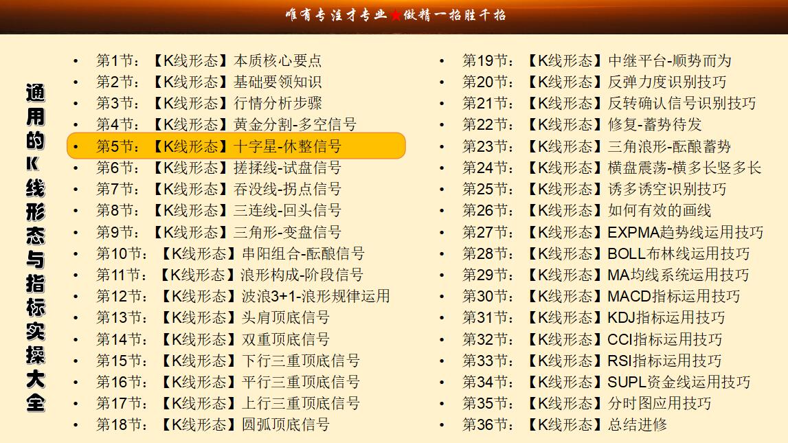 一张K线图包含了市场一切信息、也包括市场投资者的人性行为,K线形态图分析是最直观、最及时、最有效的一种方式,本系列通用K线形态课程是指(凡是有K线的市场都适用),从头到尾全是干货,不渗一点水份,能达到现学现用、立竿见影的效果。