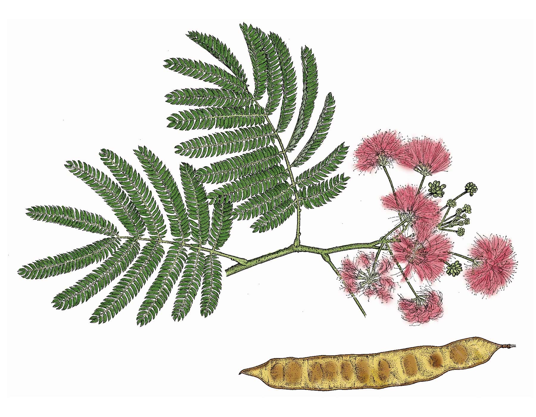 手绘含羞草,花、叶、果荚。