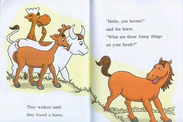 "Hello, you horses!" said the horse "What are those funny things on your heads?"