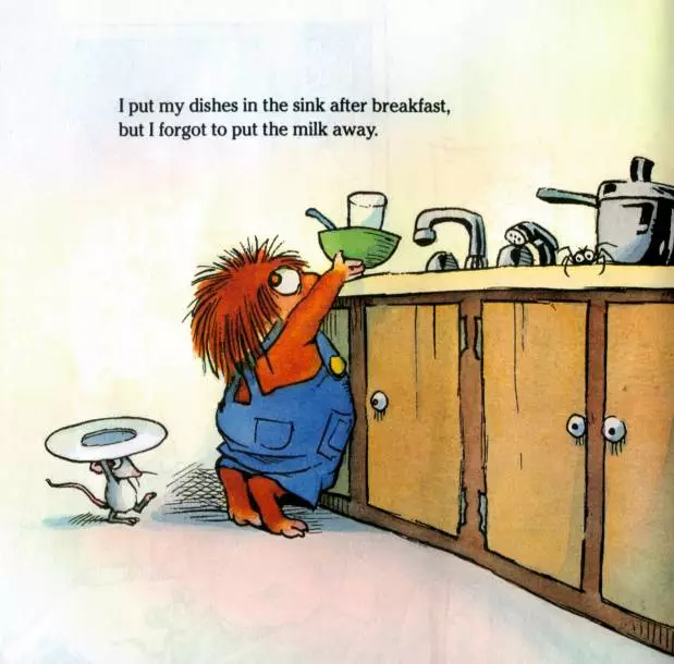 吃过早餐后,我把盘子放到了水池,但是忘记把牛奶拿走了。