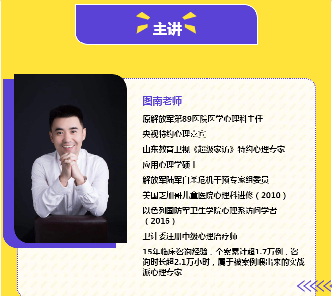 主讲人介绍:央视、山东教育卫视特约心理专家/曾在美国芝加哥儿童医院、以色列国防军卫生学院进修访学/15年金牌心理专家,擅长处理各类情感问题