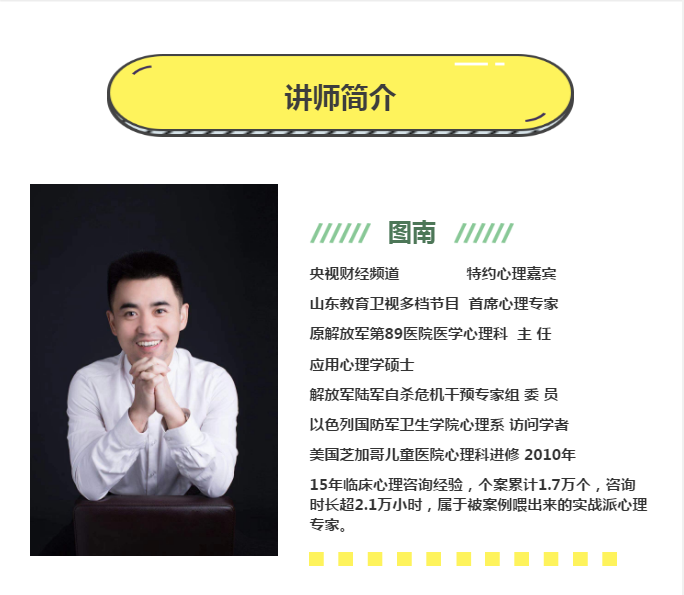 主讲人介绍:央视、山东教育卫视多家主流媒体特约心理专家/国内知名婚恋情感专家/原解放军第89医院心理科主任