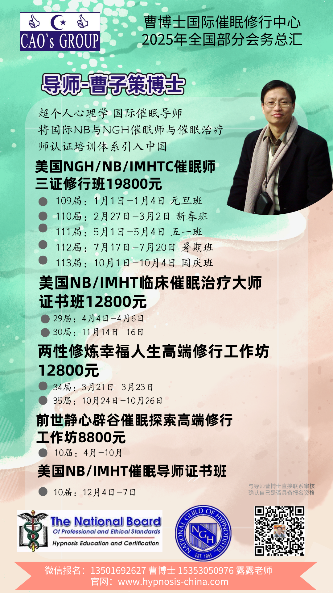 2025年曹博士亲授全球第一美国NGH/NB/IMHTC催眠师证书修行班欢迎您!!