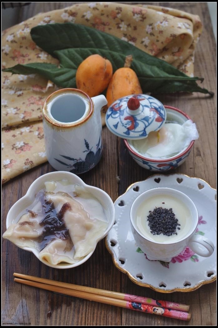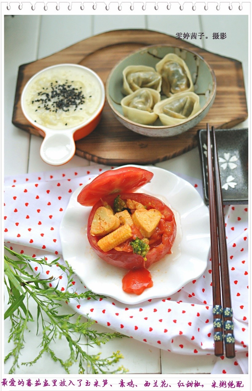 第六款:酸甜番茄盅+荠菜鲜肉蒸饺+甜杏仁小米粥。