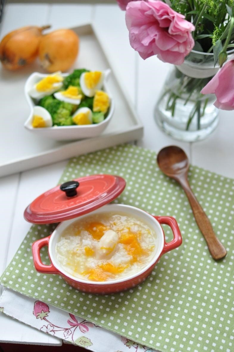 第五款: 南瓜百合小米粥+ 鸡蛋西兰花热沙拉+水果枇杷
