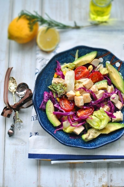 食材:鸡胸肉100克(可分两顿食用),牛油果1个,紫甘蓝6片,樱桃番茄10颗,红腰豆和玉米粒80克(提前煮好),沙拉生菜一份。