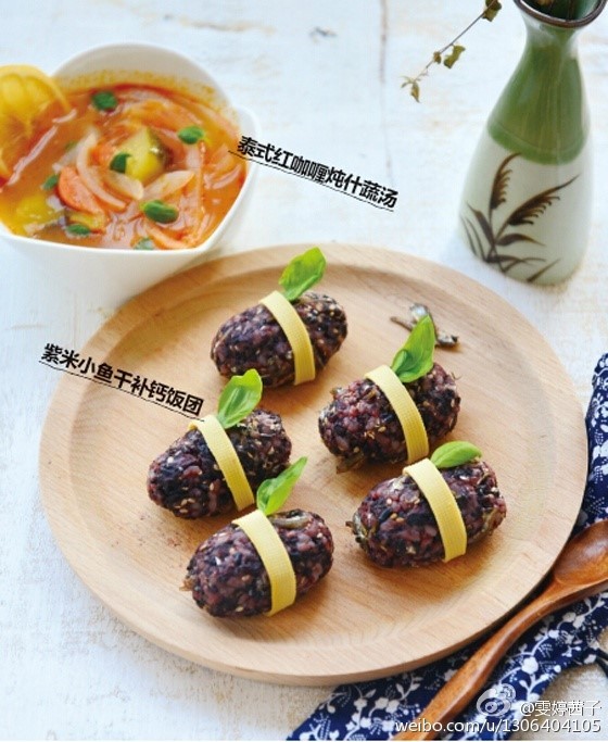 早餐搭配4:紫米小鱼干补钙饭团+ 泰式红咖喱炖什蔬汤