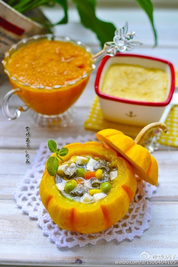 5.将海蛎羹放入蒸熟的金瓜盅内。吃完羹后连金瓜盅内的肉也可以食用。