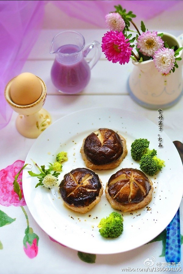 营养早餐搭配6:香菇肉饼伞+紫薯薏米小米米糊+水煮鸡蛋