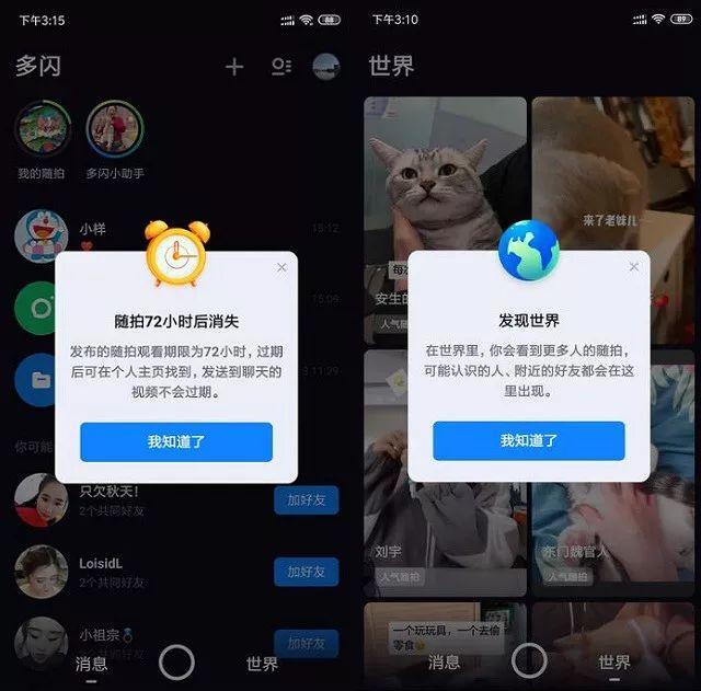 值得一提的是,“我的随拍”只有用户好友才能看到,并且有78小时有效期,三天过后,好友也无法再查看,只能自己查看。此外,“我的随拍”视频会自动同步到抖音中的我的随拍中。而“世界”的视频,则类似于抖音里的分享,陌生人都可以查看。简单说,世界里的视频,包含了陌生人的、有好友的,还有你可能认识的人的。