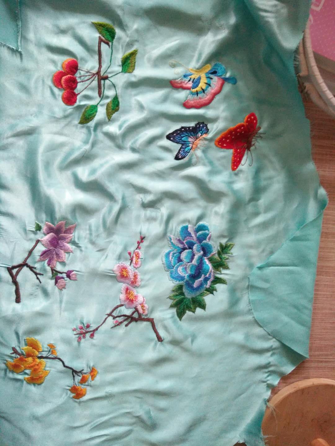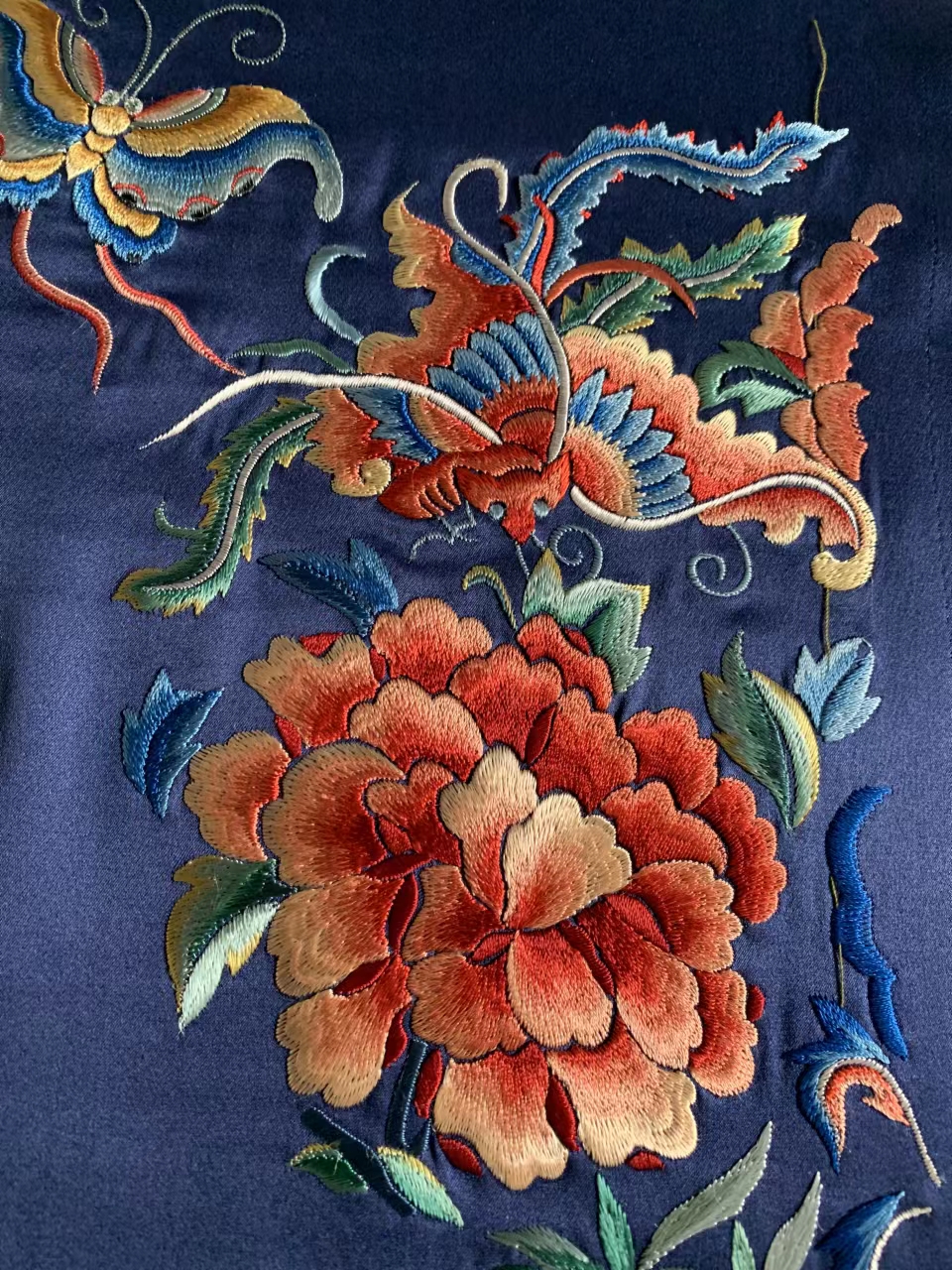 手推绣是一门传统刺绣工艺,延续了苏绣的针法配色,借助机器采用人机合一的方式在面料上绣制出丰富多彩的图案,手推绣针迹平滑圆润,配色自然灵活,速度快捷,被广泛运用在礼服、旗袍、汉服等服装上。