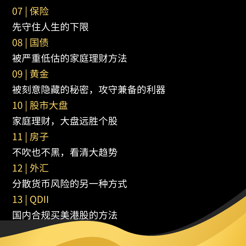 所以,课程的第一个目的是,理财种类的扫盲。精选的讲每一个资产的优势,以及这7类资产真正靠谱上手最高效的方法是什么?