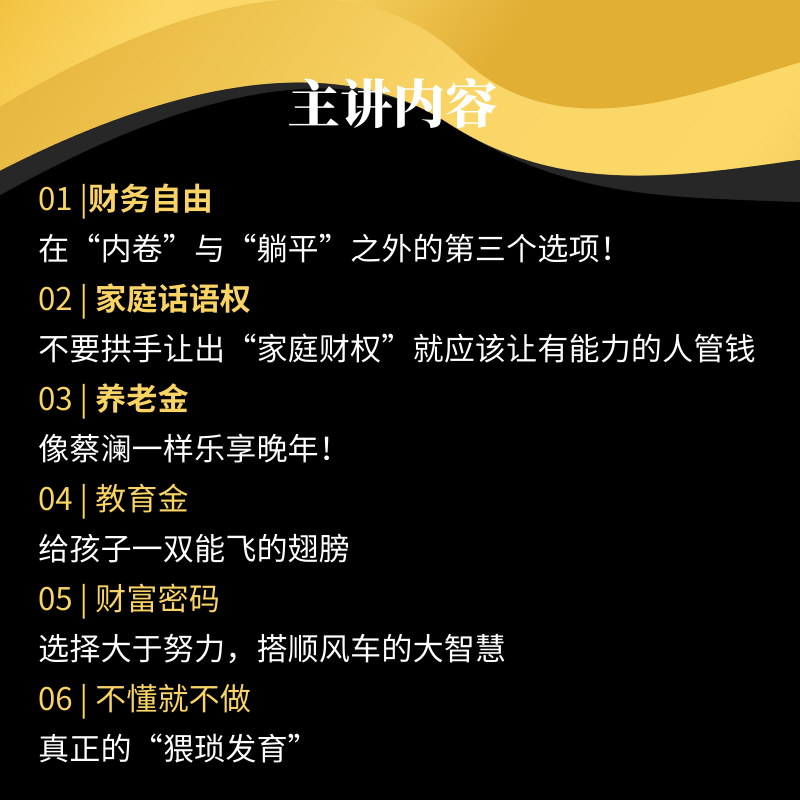 不要被市面上华而不实的理念给影偏了,我重点会讲财务自由,家庭财务的话语权,养老金和教育金这些。
